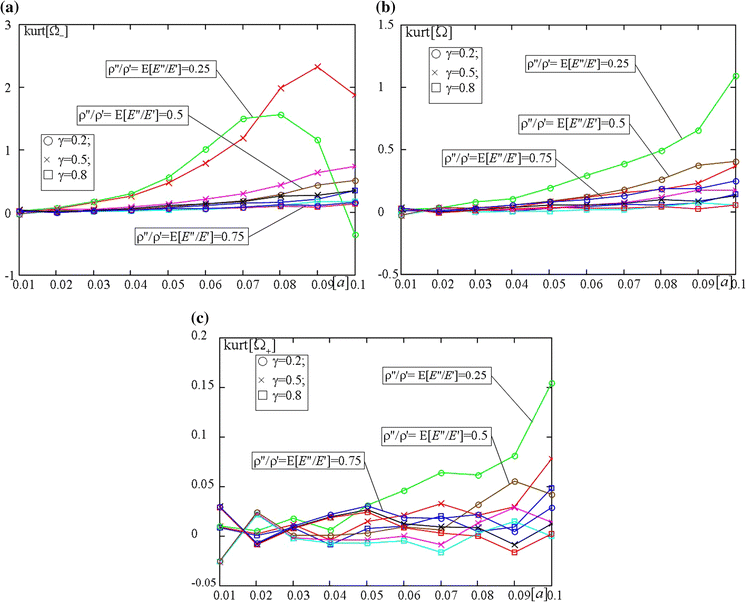 Plots of kurtoses kurt(Ω) of frequency parameters versus a ∈ [0.01;0.1] (for ratio of Young’s modulus E[E″/E′] = 0.25;0.5;0.75; for parameter γ = 0.2;0.5;0.8; d/l = 0.1; l/L = 0.1): a lower frequency parameter Ω−; b frequency parameter Ω; c higher frequency parameter Ω+