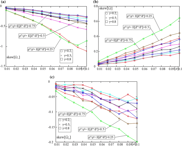 Plots of skewnesses skew(Ω) of frequency parameters versus a ∈ [0.01;0.1] (for ratio of Young’s modulus E[E″/E′] = 0.25;0.5;0.75; for parameter γ = 0.2;0.5;0.8; d/l = 0.1; l/L = 0.1): a lower frequency parameter Ω−; b frequency parameter Ω; c higher frequency parameter Ω+