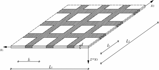 Plates under consideration are assumed to have a periodic structure along the x 1- and x 2-axis directions with periods l 1, l 2, respectively, in planes parallel to the plate midplane. By ∆ ≡ [−l 1/2, l 1/2] × [−l 2/2, l 2/2] the periodicity basic cell on 0x 1 x 2 plane is denoted. The cell size is specified by a parameter l ≡ [(l 1)2 + (l 2)2]1/2, which satisfies the condition max(d) ≪ l ≪ min(L 1,L 2), and l is called the microstructure parameter. Let (·),α ≡ ∂/∂x α denote the partial derivatives with respect to a space co-ordinate.