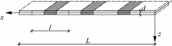 Properties of the plate, i.e. thickness d(x), elastic moduli a ijkl = a ijkl (x,z) and mass density ρ = ρ(x,z) can be periodic functions in x. Moreover, the material plate properties are assumed to be even functions in z. Denote by a αβγδ, a αβ33, a 3333 the non-zero components of the elastic moduli tensor. Hence, we define c αβγδ ≡ a αβγδ–a αβ33 a γδ33(a 3333)−1.