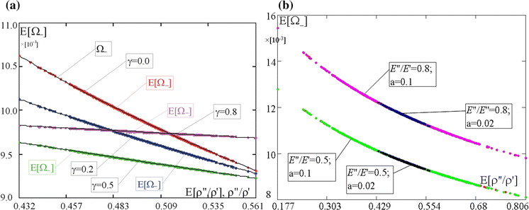 Plots of lower frequency parameters Ω− versus E[ρ″/ρ′]: a with a parameter a = 0.02 (d/l = 0.1; l/L = 0.1; E″/E′ = 0.5), b with a parameter a = 0.02 or a = 0.1 (d/l = 0.1; l/L = 0.1; γ = 0.2)