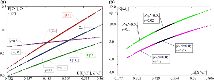 Plots of lower frequency parameters Ω− versus E[E″/E′]: a with a parameter a = 0.02 (d/l = 0.1; l/L = 0.1; ρ″/ρ′ = 0.5), b with a parameter a = 0.02 or a = 0.1 (d/l = 0.1; l/L = 0.1; γ = 0.2)