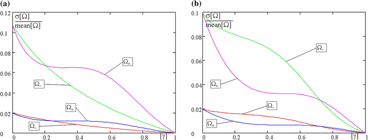 Plots of coefficient of variation of frequency parameters versus γ ∈ [0;1] for: a uncertained ratio ρ″/ρ′ (E″/E′ = 0.5); b uncertained ratio E″/E′ (ρ″/ρ′ = 0.5); (d/l = 0.1; l/L = 0.1; a = 0.02,0.1)
