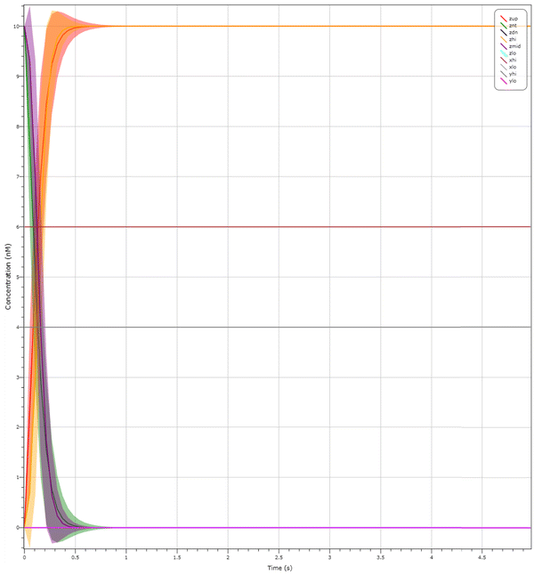 The CRN computes by transforming an input concentration into an output concentration, which reaches the appropriate level upon convergence. However, since absence of molecules cannot be measured, we employ dual-rail methodology and represent every Boolean variable with two species, denoted \(X_{hi}, X_{lo}\). Just like we cannot represent both 0 and 1 on an electrical wire, we restrict our CRNs such that either \(E[|X_{hi}|] \ge M\) or \(E[|X_{lo}|] \ge M\), but not both, can be present when a CRN has stabilised and no further reactions occur. We consider a high concentration output as correct if \(E[|X_{hi}|] > 0.8 max(X_{hi}) - 1SD(X_{hi})\), where 0.8 is a threshold normalised between the values [0, 1], max() is a function that returns the maximum molecular concentration of a species within the CRN and 1SD computes 1 standard deviation from the mean concentration of \(E[X_{hi}]\). 1SD returns 0 under the deterministic semantics. Similarly, we consider a low concentration as correct if \(E[|X_{lo}|] < 0.2 * max(X_{lo}) + 1SD(X_{lo})\).