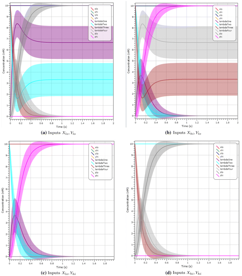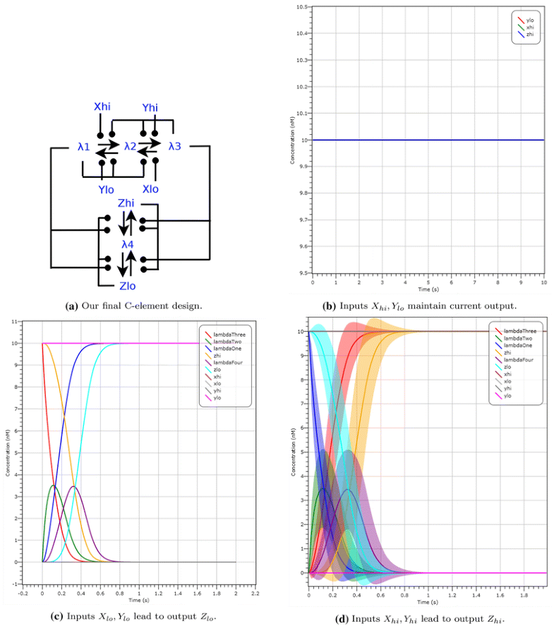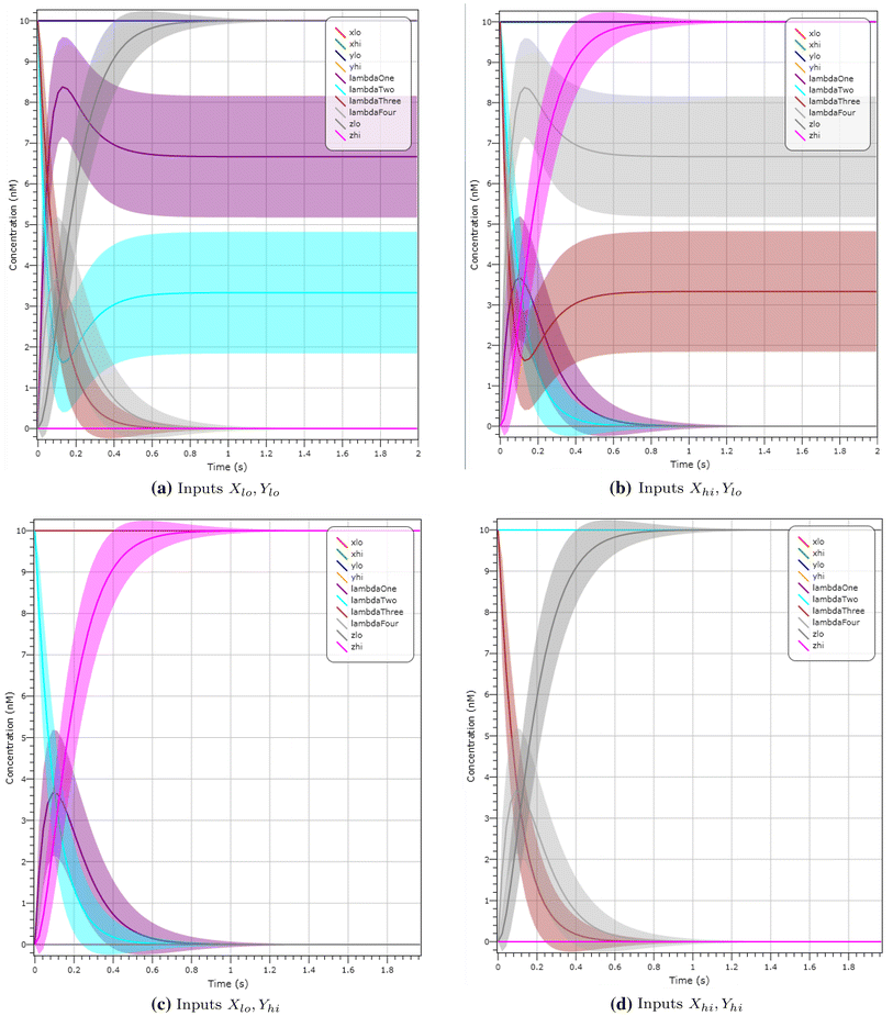 To strengthen the validation of the final C-element design, we provide two further plots for selected initial configurations. We include in Fig. 11c a deterministic plot with starting configuration of input \(X_{lo}, Y_{lo}\) at 10 molecules and output \(Z_{hi}\) at 10 molecules. After 1 s the system converges to output \(Z_{lo}\) at 10 molecules. Figure 11d shows an LNA simulation with starting configuration of input \(X_{hi}, Y_{hi}\) at 10 molecules and output \(Z_{lo}\) at 10 molecules. After 1 s we reach output \(Z_{hi}\) with probability \(\approx\) 1. Both these simulations show that our output changes if both inputs change. From Fig. 11b we observe that the output does not change if both inputs are different.