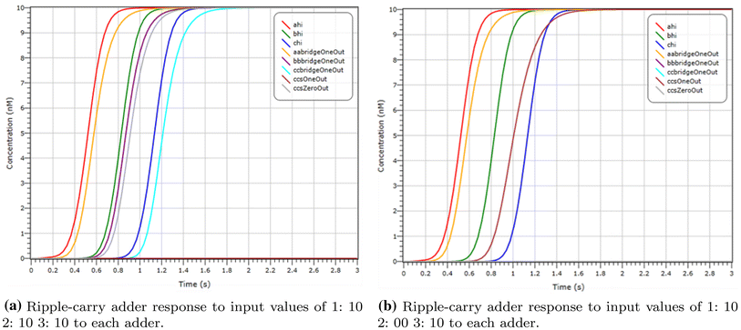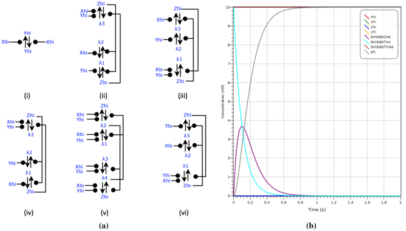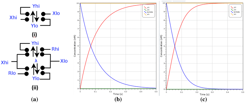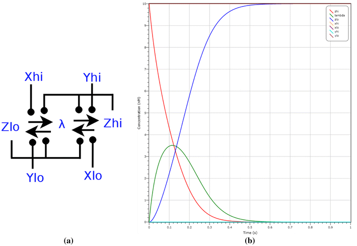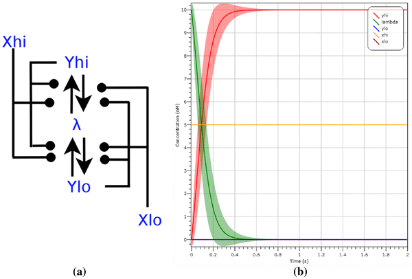 In Fig. 13b we demonstrate the operation of this arbiter by LNA simulation on inputs of \(X_{hi}\) at a concentration of 5 molecules and \(X_{lo}\) with a concentration of 0 molecules. After 0.4 s we see \(Y_{hi}\) (in red) at a concentration of 10 molecules, representing the majority.