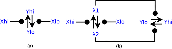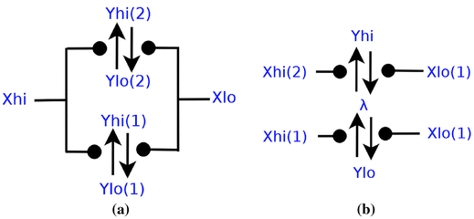 a The CRN ‘motif’, in which the input \(X_{lo}\) or \(X_{hi}\) influences the reaction \(Y_{lo} \leftrightharpoons Y_{hi}\) to produce as output the same Boolean value. b CRN obtained by composing two ‘motif’s depicted in a in series. The inputs are now \(X_{hi},X_{lo}\), outputs \(Y_{hi}, Y_{lo}\), and the remaining species have been made internal through renaming with \(\lambda\).