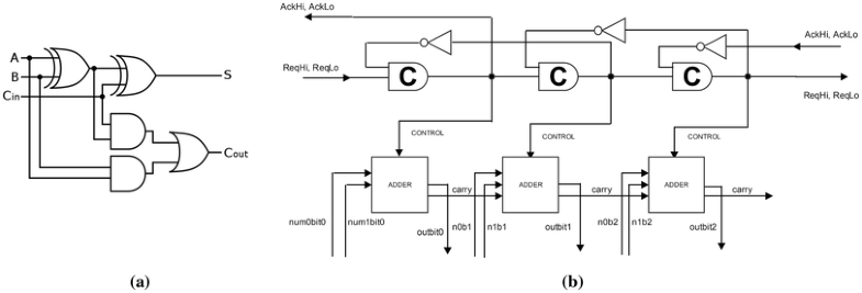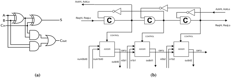 a Circuit diagram for a ripple-carry adder. b Three adders in series controlled by the C-pipeline. A carry-bit output from one adder is fed into the next as part of the input