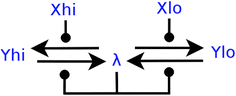 Example CRN with internal \(\lambda\) species, which converts outputs \(Y_{hi}\) and \(Y_{lo}\) to \(\lambda\), assuming a non-zero initial concentration of molecules, unless there is input \(X_{lo}\) or \(X_{hi}\) present