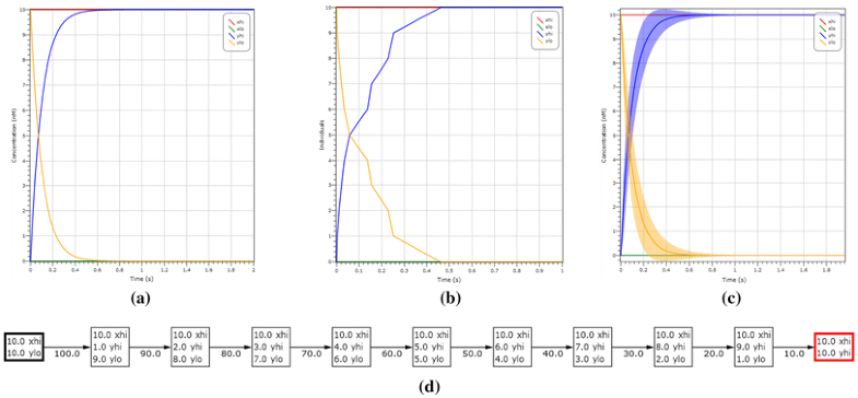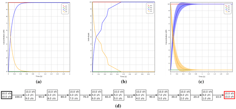 Simulation of the motif given in Example 2 under different semantics. The input is initially \(X_{hi}\) and the output is \(Y_{lo}\), both starting at a concentration of 10 molecules. In a, b, c we respectively show the deterministic solution, stochastic simulation and LNA plot with variance, where \(Y_{lo}\) is seen in blue and \(Y_{hi}\) is seen in yellow. We can observe that in all cases \(Y_{hi}\) is present after 0.4 s. In d we show the state transitions of the induced CTMC that correspond to the output switching from \(Y_{lo}\) to \(Y_{hi}\). The computation reaches the correct output state and stabilises, with no more transitions enabled. (Color figure online)