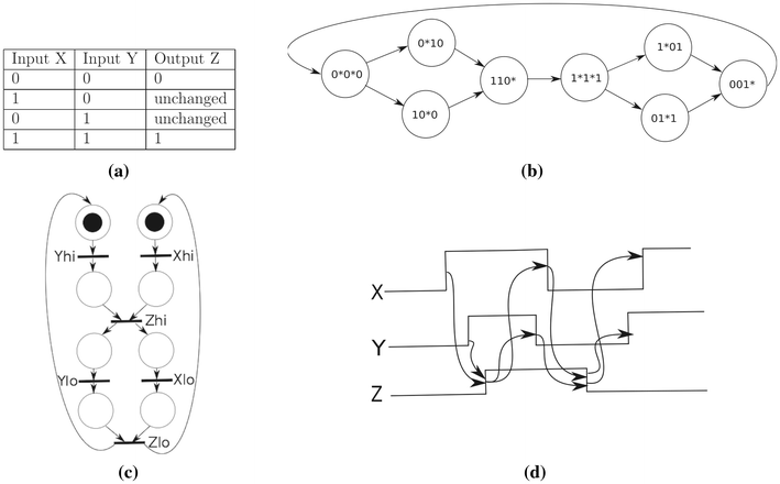 Four specifications of a C-element with inputs X, Y and an output Z. a Conventional logic table, where ‘unchanged’ means that the state of the output is the last stable configuration of 1 or 0. b State graph, in which each state denotes a configuration and a transition is caused by the presence of a signal, where * indicates that the signal is excited. c 1-bounded Petri net specifying the Muller C-element. d Timing diagram for the C-element
