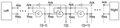 Muller pipeline. Signals are propagated from left to right using request and acknowledge signals. The pipeline effectively queues data, only allowing a transition to occur when a further signal has been acknowledged
