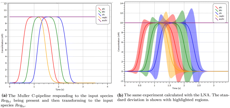Since deterministic semantics is not accurate for low molecular populations, we additionally explored stochastic semantics. Visual GEC exports models to the probabilistic model checker PRISM, which then enables verification of the induced continuous-time Markov chain against temporal logic properties. This allows one to check that the circuits ensure the correct temporal ordering of the events, for example, for the Muller pipeline seen in Fig. 6, that the species in the first stage of the pipeline is present before the species in the second, i.e. with probability 1, and that the signal is eventually propagated to the end of the pipeline. PRISM implements numerical solution of the CME, which is exponential in the initial number of molecules and hence not scalable, and analysis based on stochastic simulation, which is time consuming. We thus additionally used an experimental implementation of the LNA within Visual GEC, based on Cardelli et al. (2015). As well as being capable of checking temporal logic properties (Cardelli et al. 2015; Bortolussi et al. 2016), the LNA can plot the species concentration over time together with standard deviation, and is fast and reasonably accurate even for low molecule counts. Moreover, compared to the deterministic semantics, LNA provides important information about stochasticity that may affect the robustness of the circuits, and which can be explored further with CME, stochastic simulation, or verifying that the circuit converges with probability 1 to a single value.