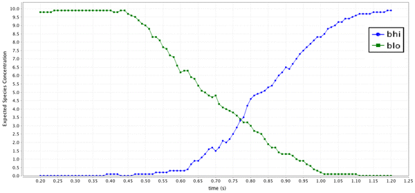 | “Probability that the species \(A_{hi}\) reach their maximum population within 10 s” | \(A_{hi} < Th\) | \(P=?[\text {true } {\mathcal {U}}^{[0,10]} A_{hi} >= Th]\) | 1 |
