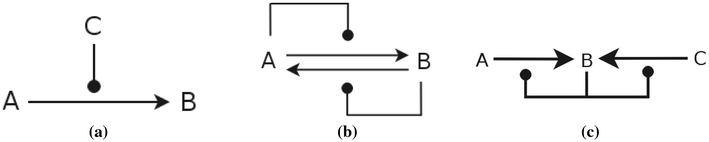 Diagrammatic notation for CRNs. a CRN with the single reaction \(C + A \rightarrow C + B\), in which species C catalyses the reaction \(A \rightarrow B\). b CRN with reactions \(\{ A + A \rightarrow A + B, B + B \rightarrow B + A \}\), in which species A and B are both reactants, products and catalysts. c CRN with reactions \(\{ A + B \rightarrow B + B, C + B \rightarrow B + B \}\), which demonstrates that B can be catalytic to multiple reactions