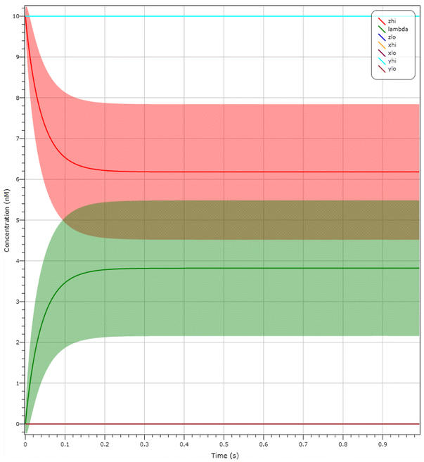 LNA plot for the candidate CRN for the dual-rail Muller C-element design in Fig. 8. With a starting configuration of inputs \(X_{lo}, Y_{hi}\) at a concentration of 10 molecules and output \(Z_{hi}\) at a concentration of 10 molecules, we can observe that after 0.3 s \(Z_{hi}\) (seen in red) is at a concentration of 6 molecules and \(\lambda\) is at a concentration of 4 molecules (seen in green). The shaded regions represent standard deviation. As we can see, with a non-zero probability we cannot distinguish the signals. (Color figure online)