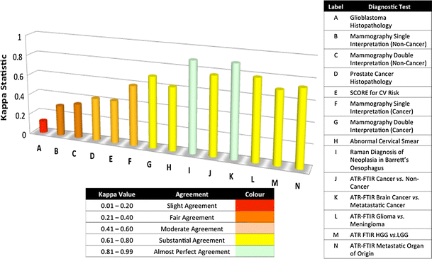 Kappa values for a range of currently used diagnostic tests and proposed spectroscopic diagnoses (A) comparing the histological diagnosis of glioblastoma between local, institutional and central neuro-oncopathology reporting, (B and C) mean Kappa values for breast mammograms using single and double interpretations for non-cancer diagnosis, (D) correlation between Gleason score on biopsy and following prostatectomy, (E) correlation between two commonly used CV risk algorithms Framingham Risk Score (FRS) and European Systemic Coronary Risk Evaluation System (SCORE) compared, (F and G) mean Kappa values for breast mammograms using single and double interpretations for cancer diagnosis, (H) peer review of abnormal cervical smears, (I) Raman spectral prediction of Barrett’s neoplasia in vitro compared to consensus pathology opinion (n = 3 pathologists), (J-N) Kappa values for ATR-FTIR spectroscopic diagnosis based upon optimum sensitivity models over all strata when comparing against clinical diagnosis following multidisciplinary team (MDT) meeting