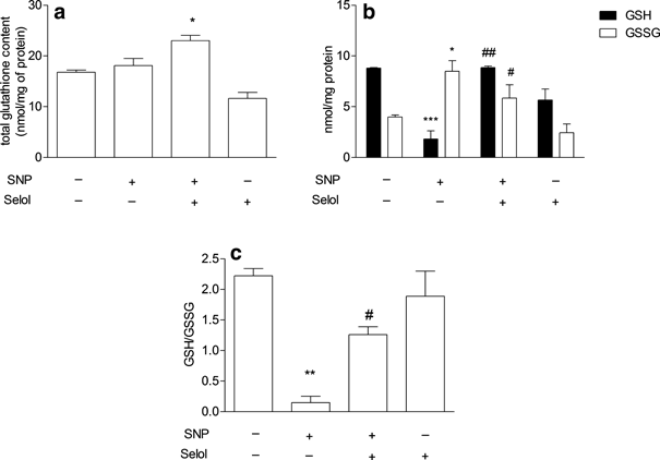 The effect of Selol on SNP-mediated glutathione redox imbalance. a Total glutathione and b oxidized (GSSG) as well as reduced (GSH) glutathione level after 24 h of incubation with Selol (20 μg/ml Se) and SNP (0.5 mM). c GSH/GSSG ratio. n = 4–6; *p < 0.05; **p < 0.01;***p < 0.001 versus control; #p < 0.05; ##p < 0.01 versus SNP