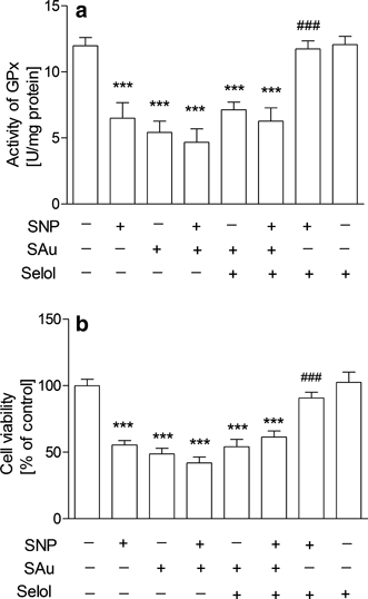 In summary, we propose a model whereby Selol modulates the impact of SNP on GPx and other antioxidant enzymes and prevents SNP-induced cell death. This successful in vitro application in a model of ROS-/RNS-mediated cytotoxicity suggests Selol as a promising compound in therapy of diseases related to oxidative/nitrosative damage and dopaminergic cells death. This potentially attractive mechanism deserves further in vivo clarification including in-depth analysis of Selol’s impact on other aspects of neuronal death mechanisms.