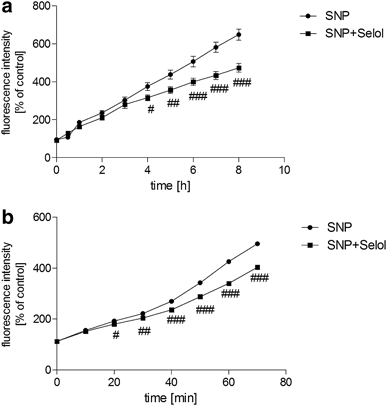 The effect of Selol on time-dependent ROS generation induced by SNP. a PC12 cells treated with Selol (20 μg Se/ml) and SNP (0.5 mM) stained by DCFH-DA were subjected to fluorimetric analysis for 8 h. b Fluorescence intensity was measured in the presence of Selol (20 μg Se/ml) and SNP (0.5 mM) for 70 min in cell-free system. Fluorescence intensity is expressed as percentage of control; n = 6–8; #p < 0.05; ##p < 0.01; ###p < 0.001 versus SNP