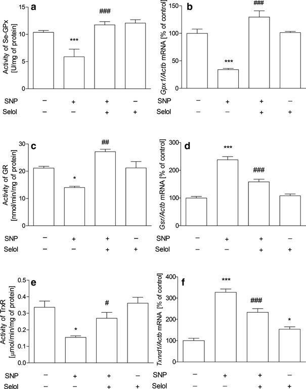 The effect of Selol on SNP-evoked antioxidant enzyme changes. The activities and mRNA expression of antioxidant enzymes after 24 h of incubation of PC12 cells with Selol (20 μg Se/ml) and SNP (0.5 mM) were determined spectrophotometrically and by real-time quantitative RT-PCR as described in section “Materials and Methods”. a, b Se-GPx; c, d GR and e, f TrxR. n = 4–10; *p < 0.05; ***p < 0.001 versus control; #p < 0.05; ##p < 0.01; and ###p < 0.001 versus SNP