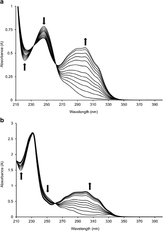Overlaid representative UV-vis spectra of (a) 2 and (b) 3 in acetonitrile (2 x 10−5 M) after various periods of 365 nm irradiation. Arrows indicate absorbance trends with time and irradiation times used were 0, 30, 60, 90,120,150, 240, 300, 360,450, 570, and 690 s, respectively.