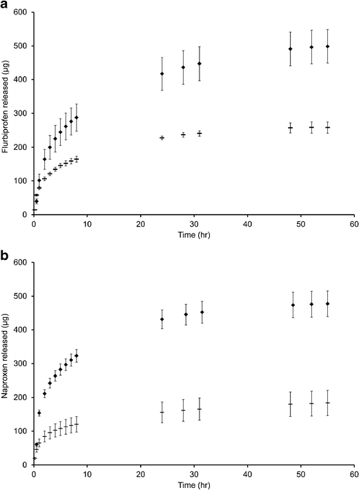Graphs illustrating the amount of drug released following irradiation periods of 10 (−) and 30 (♦) min (mean ± st. dev, 4 replicates).