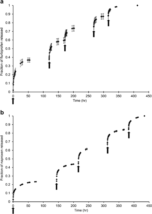 Cumulative fraction of total photo-liberated drug released from pMEA conjugate matrix following successive periods of 365 nm irradiation as indicated by arrows (mean ± st. dev, 4 replicates).