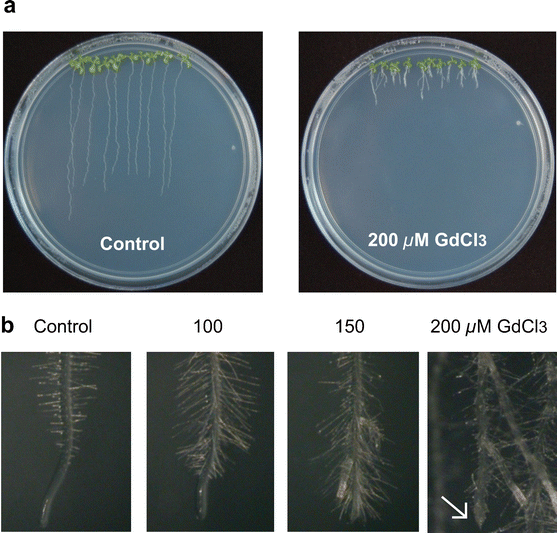 Effects of Gd3+ on Arabidopsis root system architecture. Arabidopsis WT (Col-0) seedlings were grown for 12 days in medium supplemented with the solvent (left plate) or with 200 μM GdCl3 (right plate). Microscope photographs (b) of root tips from seedlings supplemented with increasing concentrations of Gd3+. Photographs in (a) are representative of 9 independent plates analyzed (GIF 165 kb)