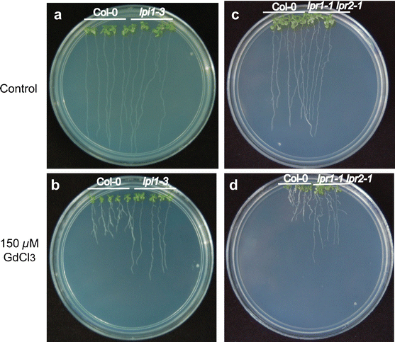 Effects of Gd3+ on Arabidopsis root system architecture in WT and low phosphate resistant mutants. Arabidopsis WT (Col-0) seedlings and lpi1-3 and lpr1-1 lpr2-1 mutants were grown for 12 days in medium supplemented with the solvent (upper plates) or with 150 μM GdCl3 (lower plates). Photographs are representative of 9 independent plates analyzed. The experiment was repeated three times with similar results (GIF 166 kb)