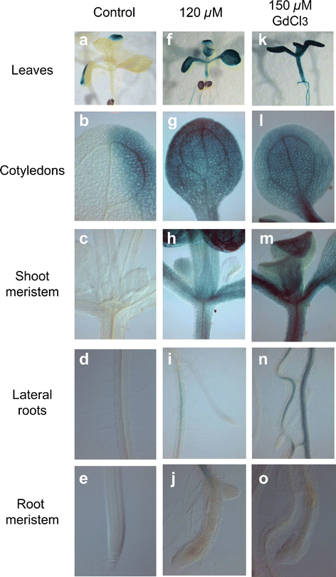 Effect of Gd3+ on AtMGD2::GUS expression. GUS staining was performed overnight in WT plants grown for 12 days in medium with solvent (controls) or with two increasing concentrations of GdCl3 (120 and 150 μM). Gd3+ induced expression of AtMGD2 in leaves (f and k), cotyledons (g and l), shoot meristem (h and m), lateral roots (i and n), but not in the root meristem (j and o), despite the clear effect of gadolinium in this zone. Photographs are representative of 20 stained plants (GIF 184 kb)