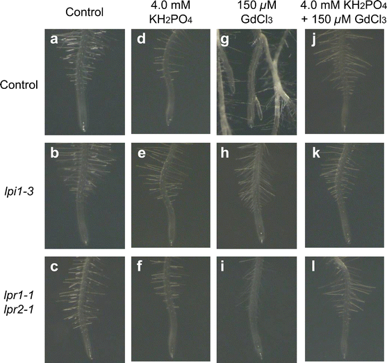 Effect of phosphate in root tip structure of WT and low phosphate resistant mutants treated with Gd3+. WT and mutant seedlings lpi1-3 and lpr1-1 lpr2-1 were grown side by side for 12 days on medium with different P treatments supplied or not with Gd3+ and the primary root tip photographed. Notice that a 4 mM P treatment completely reverts the effect of Gd3+ on differentiation in root tips (GIF 135 kb)