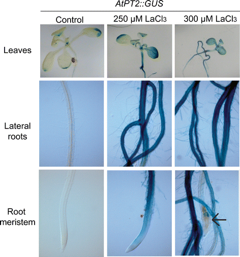 Effect of La3+ on AtPT2:GUS expression. AtPT2:GUS expressing seedlings were grown for 12 days in medium supplied with DMSO (Control) or with the indicated LaCl3 concentrations. Photographs are representative of 20 stained plants. Arrow in 300 μM LaCl3 treatment indicates the primary root. The experiment was repeated three times with similar results (GIF 124 kb)