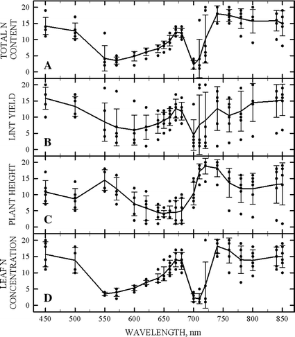 These results support findings of Zhao et al. (2005), Fridgen and Varco (2004) and Buscaglia and Varco (2002). Although the aforementioned studies examined leaf reflectance, they concluded that reflectance in the red edge (700–720 nm) region to be the most sensitive to fertilizer N rate treatments and chlorophyll content. Zhao et al. (2005) and Buscaglia and Varco (2002) similarly found cotton leaf reflectance in the green (~550 nm) region to be sensitive to fertilizer N rate treatment and chlorophyll content. These results also support findings in several other crops; strong separation between N rates as determined by canopy and leaf reflectance at 550 nm has been noted in corn (Blackmer et al. 1996; Shanahan et al. 2001) and several other crops (Thomas and Gausman, 1977; Gitelson et al. 1996).
