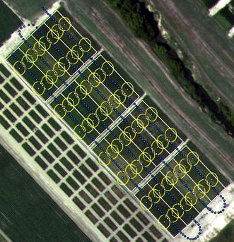 Image displaying reflectance measurement points (white and blue dots), plant sampling points (green dots), and applied buffer constraints (yellow circles) across field trial at one sampling date. Blue dots represent reflectance measurements which were excluded from analysis. White dots represent measurements which corresponded to plant sampling points and were therefore included in the analysis. Reproduced from Raper et al. (2013) (Color figure online)