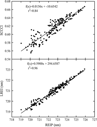 Relationships between LREI and SCCCI with REIP from 2008 through 2010 for the third week of flower bud formation and early flowering