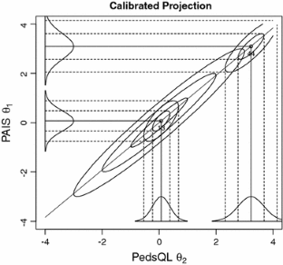 Descriptive statistics were computed describing the relationships among scores on the PAIS, the PedsQL™ Asthma Symptoms, Treatment, Worry, and Communication Scales, and the DISABKIDS Asthma Impact and Worry Scales for approximately 300 children ages 8–17. A novel linkage method based on item response theory (IRT), calibrated projection, was used to link scores on the PedsQL™ Asthma Symptoms Scale with the metric of the PAIS.