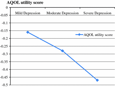 Of all four groups, individuals with co-morbid CVD and depression reported the greatest deficits in AQOL utility scores (Coef: −0.32, 95% CI: −0.40, −0.23), after adjusting for covariates. Those with MDD only (Coef: −0.27, 95% CI: −0.30, −0.24) and CVD only (Coef: −0.08, 95% CI: −0.11, −0.05) also reported reduced AQOL utility scores. Second, the influence of MDD and CVD on HRQOL was shown to be additive, rather than synergistic. Third, a significant dose–response relationship was observed between depression severity and HRQOL. However, CVD and depression severity appeared to act independently of each other in impacting HRQOL.