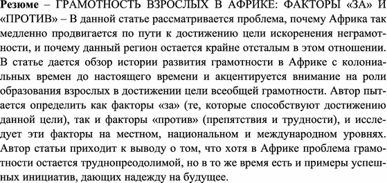 This paper examines the question of why Africa has made such slow progress towards the goal of eradicating illiteracy, and why it remains an exceptionally disadvantaged region in this respect. The article surveys the history of the development of literacy in Africa from colonial times to the present day, focusing on the role of adult education in pursuing the goal of universal literacy. The author seeks to identify both the “push” factors (those favouring the pursuit of this goal) and the “pull” factors (the obstacles and hindrances), examining these factors at the local, national and international levels. The author concludes that, while the literacy challenge in Africa remains a formidable one, there are examples of successful initiatives that give hope for the future.