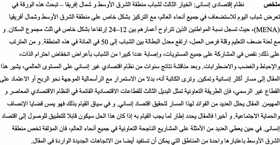 This paper looks at the vulnerability of today’s youth worldwide, with a particular focus on the Middle East and North Africa (MENA), where the proportion of citizens aged 12–24 is particularly high at one-third of the total population. Cursed with poor education and few work opportunities, the youth unemployment rate has risen to 50 per cent in this region. There is a consequent lack of participation at all levels, and a large number of youth are showing symptoms of low self-esteem, frustration, anger and unrest. After discussing the outcomes of years of an inhuman economic system on a global level, this article points to a more humane and empowering path. The author argues that, instead of continuing with profit-oriented capitalism or relying on the informal sector, the co-operative way represents a third alternative to existing economic sectors within the dominant contemporary economic system. The article analyses the many benefits of this path for the realisation of a humane economy. In so doing, it touches on issues of equity and social protection. Finally, the article outlines what needs to be done if this is to be a viable solution for a human economy. While giving many examples of successful co-operative enterprises worldwide, the author singles out the MENA region as one which could also benefit from the new trends outlined.