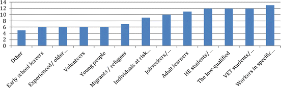 Migrants and refugees are not a dominant user group in the area of validation in Europe. Our analysis of a selection of the 124 EU-funded projects from the EVE database reveals that only 6 explicitly mention “migrants” in their abstracts. Thirteen projects were related to the development of validation practices on mobility projects.7 While their work in the area of mobility may result in solutions which are relevant to at least some types of immigrants, their primary focus was not on immigrants. At this point, we take a closer look at individual European countries to find out whether there are any discernible differences among them.