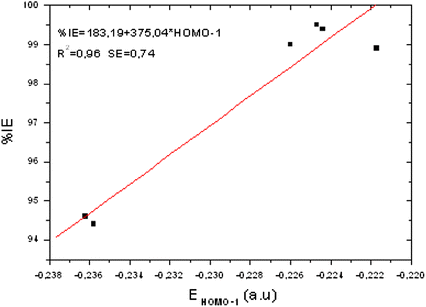 Correlation of HOMO-1 energy with percent inhibition of L1–L6