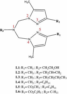 According to the nature of the R1 and R2 substituents, the bipyrazol compounds were classified in two classes (a: L1 to L4 and b: L5 and L6). The inhibition of these compounds was determined experimentally by using both electrochemical polarization and weight loss techniques, and was found to be excellent inhibitors of copper corrosion [18]. The slight decrease in the inhibition efficiency observed between L1, L2, L3, L4, L5, and L6 is due to an effect of R 1. It is worth noting that the experiment showed that the substitute fixed on the nitrogen of the amine does not have much effect on the inhibition efficiency.