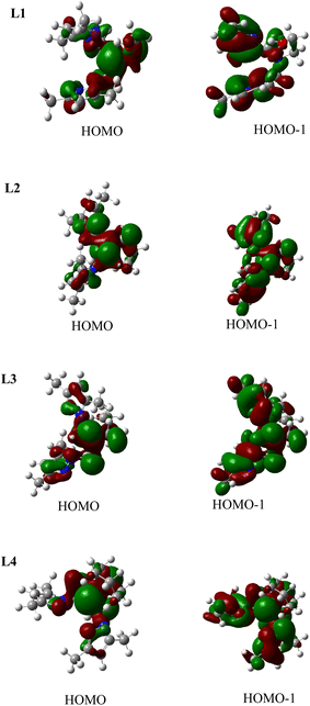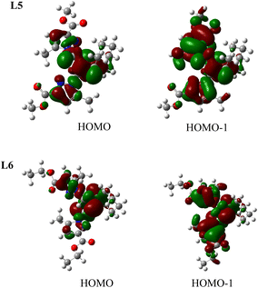 Calculated HOMO and HOMO-1 molecular orbitals of the studied molecules L1–L6 using the B3LYP/6-31G method