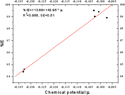 Correlation of chemical electronic potential μ with percent inhibition of L1–L6