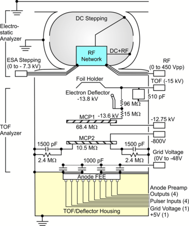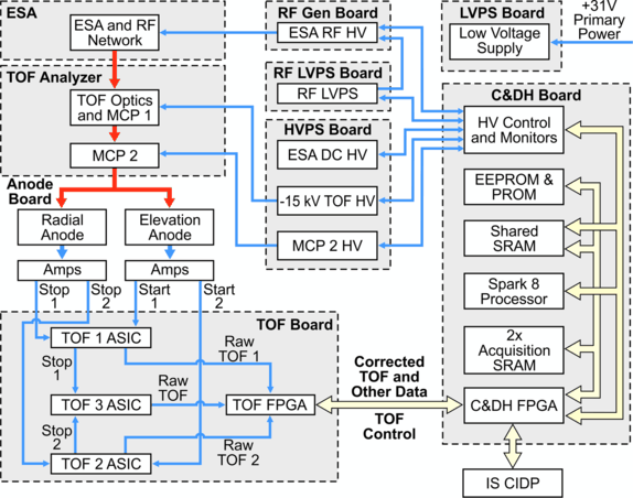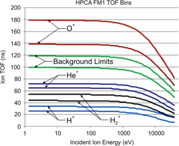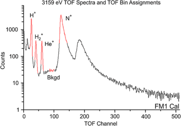 Figure 20 shows a sample TOF spectrum at 3.159 keV plotted on a log scale to show that all species are separated at ∼10 % of peak height, easily meeting the resolution requirement of M/ΔM=4 at FWHM. The areas marked in red delineate TOF channel boundaries used for ion species selection. It is also evident from Fig. 20 that although there is a noise floor that increases at low masses, the signal peak to noise ratio is always >10. Figure 31 shows measured TOF channel boundaries over the entire energy range.