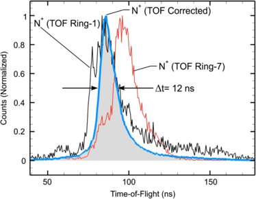 Experimental data in Fig. 50 differ slightly from theory because of an offset of 7.27 ns in the flight model delay line. Calibrating out the offset by subtracting 7.27 ns makes the two fits nearly identical. The difference between the N+ TOF peak at 85 ns for 1.0 keV ions (Fig. 23) vs. 75 ns here (including the TOF offset) is due to use of one amplifier per ring for data in Fig. 23 vs. flight configuration delay lines in Fig. 50. (Data in Fig. 23 could only be obtained with separate amplifiers—not the delay lines in flight configuration.)