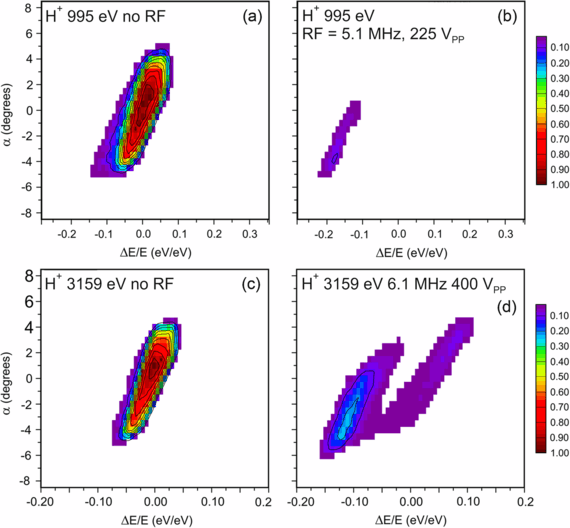 As mentioned earlier, attenuation has an effect on the azimuth-energy passband (Fig. 24). The large reduction in transmitted flux at both energies in the figure is apparent from the color scale on the right. In addition to attenuating ion fluxes however, the RF field also shifts the main passbands to lower voltages by about 13 % and to lower azimuths by −2°. The shifts are caused by asymmetries in the ESA electric field introduced by the RF (refer back to trajectories in Fig. 9). Using this calibration information the small shifts in energy and FOV passbands can be taken into account during analysis. Figures 24c and 24d show similar responses for 3.159 keV, which is near the upper end of the RF operating range. As expected there is less attenuation than in the 0.995 keV case. However, by this point proton fluxes have fallen by roughly an order of magnitude. The RF also creates side lobes on the distributions (Figs. 24b and 24d) but they have negligible intensity and can be ignored or corrected in analysis.