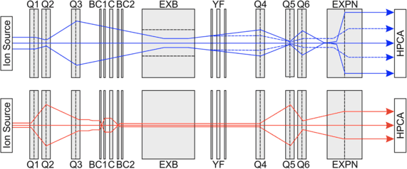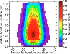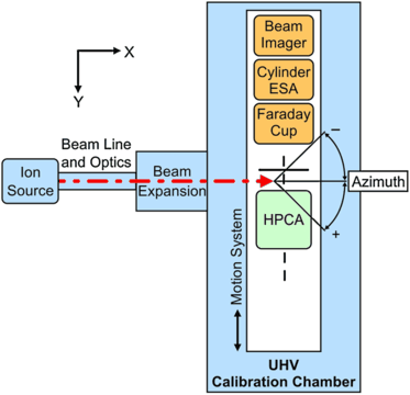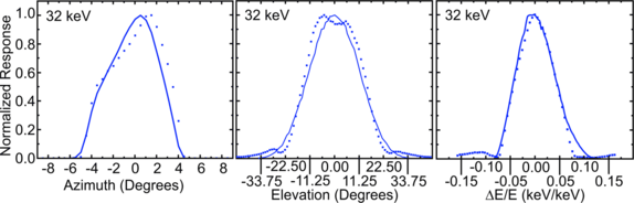 The procedure for performing a calibration step was to set up the ion beam in the appropriate configuration and then capture its characteristics using the CRU. If the beam species was changed from one run to the next then the E×B filter was swept to establish composition. Once the beam was set up the HPCA ESA was commanded to perform a micro-energy scan in which the ESA energy passband was covered in a series of 64 micro-steps (∼1 % of the passband width) out to ±20 % of the beam center. By micro-stepping the ESA we obtain a detailed energy passband at every calibration point. This is particularly important when characterizing the HPCA’s azimuth-energy passband. It is also of interest when covering the elevation passband in order to make certain that there is no cross-coupling between elevation and energy.
