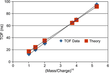 Plot of ion TOF vs. (M/q)1/2 for H+, \(\mathrm{H}_{2}^{+}\), He+, N+, O+, and \(\mathrm{N}_{2}^{+}\). Data were taken at the pre-programmed energy step of 2.269 keV